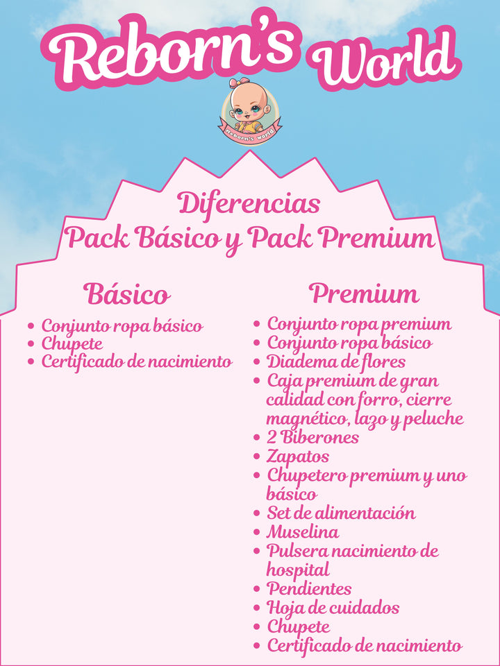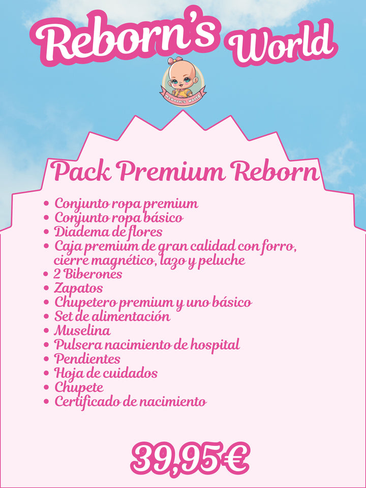 El pack premium es perfecto para regalar o simplemente para disfrutar de tu modelo con todos los accesorios que le dará a tu bebé reborn ese toque de distinción.